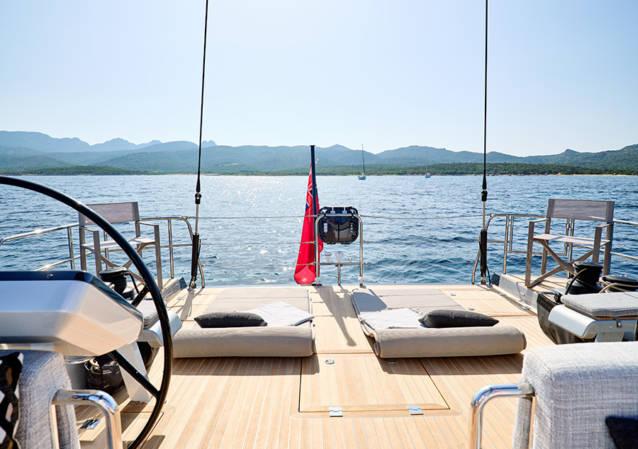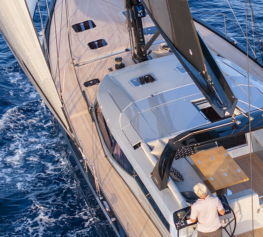 Der 62-Füßer kann einhand gesegelt werden und ist sehr sicher konzipiert. Bei widrigen Bedingungen kann das Cockpit mit einem Hardtop oder Bimini geschützt werden.