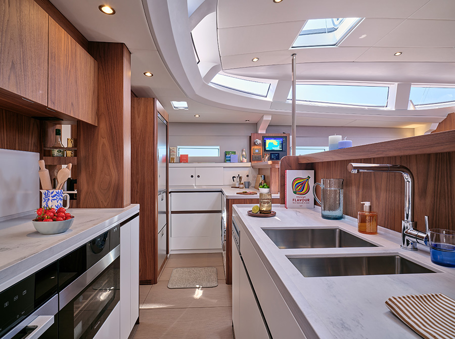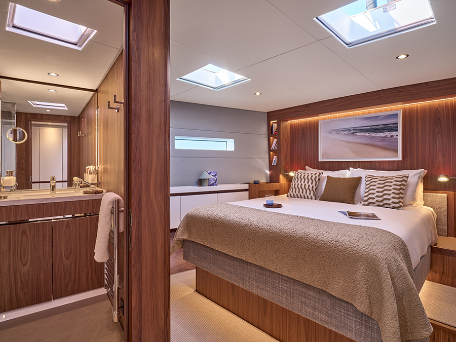 Ein zentrales Merkmal ist das geschützte Cockpit mit dem charakteristischen „Targa“-Bügel aus Carbon, der das Großsegel führt und maximale Sicherheit gewährleistet. Die beiden Steuerstände sind weit vorne platziert und lassen sich je nach Bedarf mit einem Bimini oder einem festen Hardtop vollständig abdecken – ideal für Hochseereisen, auch in raueren Regionen. Die gesamte Bedienung kann vom Steuer aus erfolgen, was selbst Einhandsegeln ermöglicht. Auch das Interieur wurde komplett neu gedacht. Jean-Marc Piaton und sein Team entwickelten ein offenes, lichtdurchflutetes Layout mit drei Varianten, hochwertiger Ausstattung und wohnlichem Flair. Besonders hervorzuheben: die großzügige Eignerkabine im Bug mit Inselbett, Panoramafenstern und Bad en suite. Zwei Gästekabinen achtern sorgen für komfortable Unterbringung, optional ergänzt durch eine Crewkabine mit separatem Zugang.