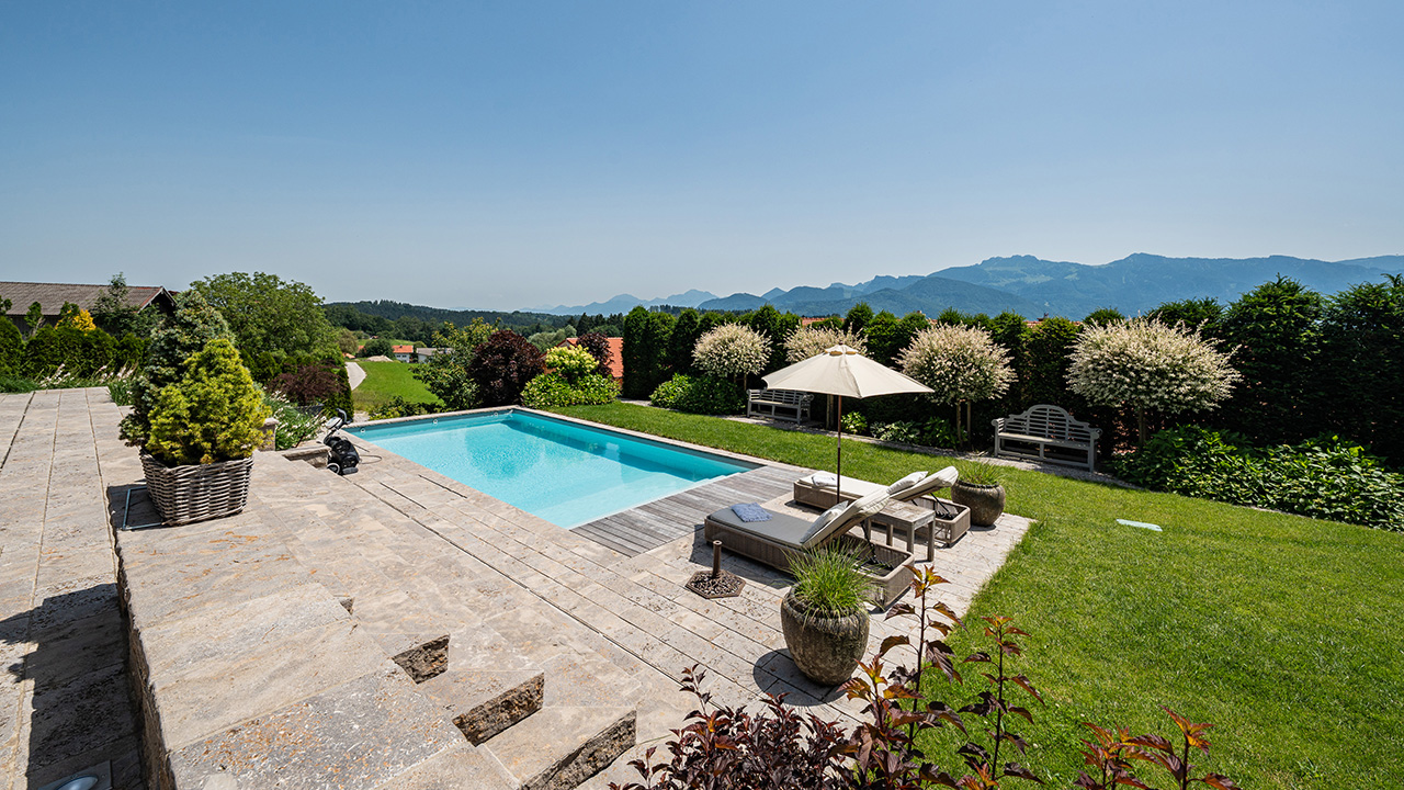 Der Außenbereich überzeugt mit viel Liebe zum Detail: Terrassen aus hochwertigem Münsinger Kernstein, ein beheizter Freisitz sowie ein sonniger Garten mit beheizbarem Pool schaffen ein außergewöhnliches Ambiente für entspannte Stunden mit Blick auf die Alpen. Moderne Haustechnik wie eine effiziente Geothermie-Heizanlage, KNX-BUS-System und umfangreiche Sicherheitslösungen runden das Gesamtbild ab. Ein Zuhause für Menschen, die das Besondere schätzen – stilvolles Wohnen in einer der schönsten Regionen Oberbayerns. Objekt-ID: 6986