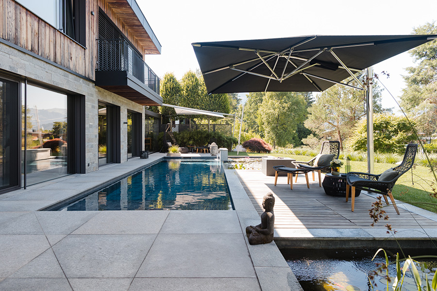 Der Fokus liegt auf Ruhe, Weite und dem Spiel von Wasser und Stein. Der elegante Pool mit integrierter Wasserwand bildet das Herzstück der Anlage. Von der großzügigen Terrasse aus öffnet sich der Blick auf das beeindruckende Bergpanorama – eine Bühne der Natur, inszeniert mit zurückhaltender Eleganz.