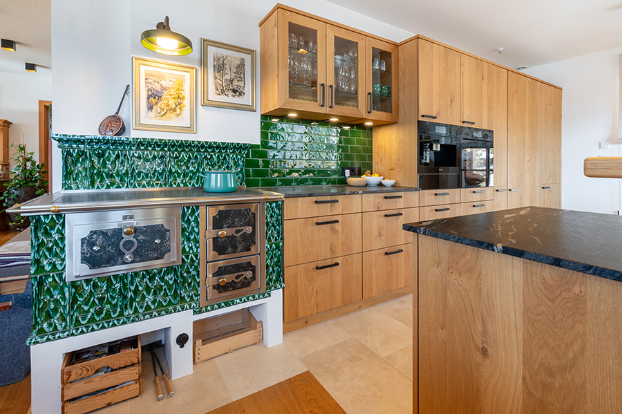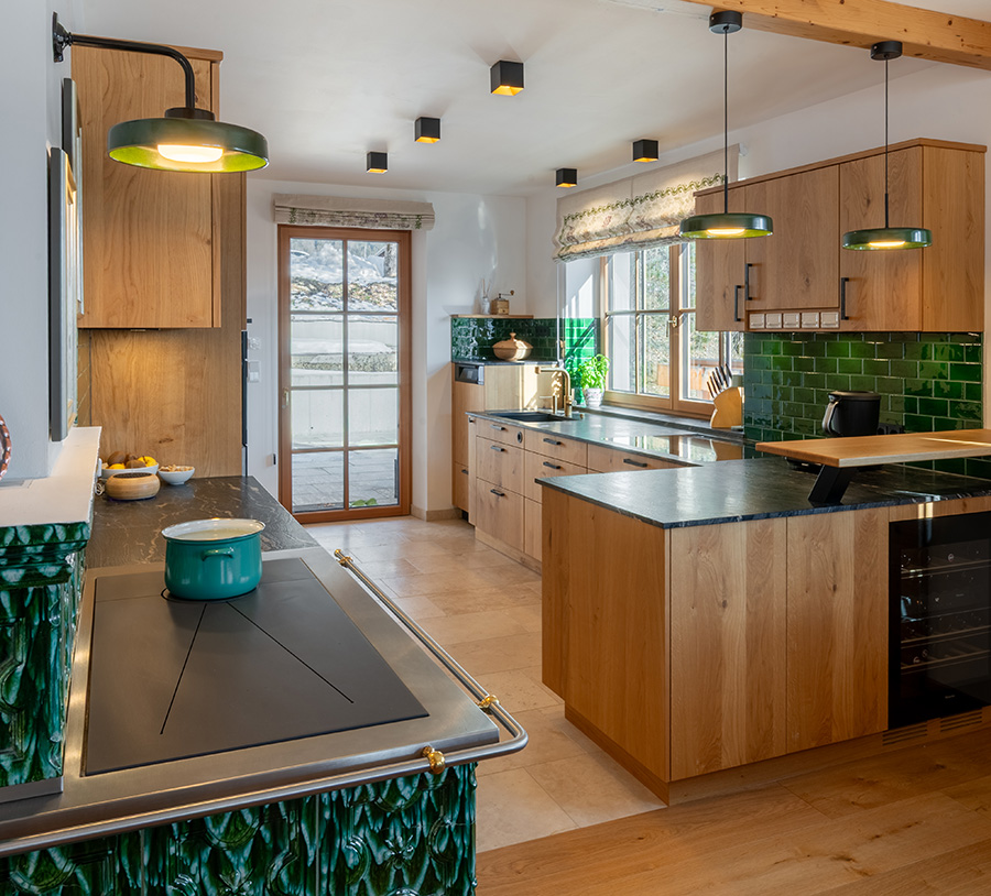 Das Herzstück des Küchenprojekts von „Wohnhaus Grill & Ronacher“ ist ein historischer, sattgrüner Kachelofen – ein Solitär voller Charakter. Seine ornamentale Oberfläche trifft auf maßgefertigte Eichenmöbel, dunkle Arbeitsplatten und fein gesetzte Lichtquellen. Der Dialog aus Handwerk und moderner Funktionalität verleiht dem Raum Tiefe. Hier verschmilzt alpine Wohnkultur mit zeitgemäßem Komfort zu einer atmosphärischen Komposition, die Wärme nicht nur spendet, sondern spürbar macht.