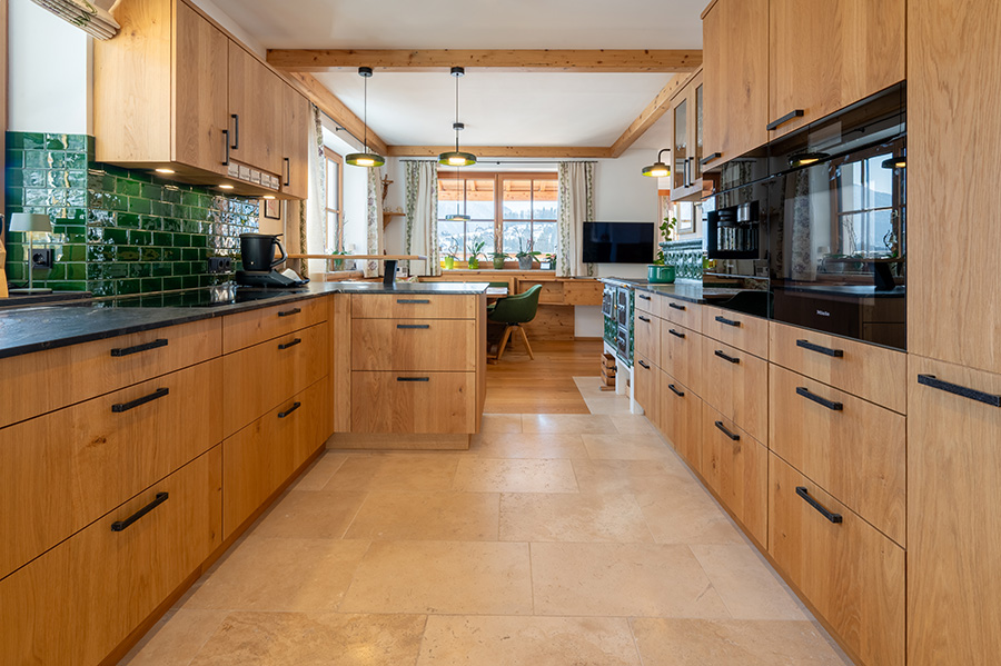 Historisches Handwerk trifft auf maßgefertigte Eichenmöbel und moderne Funktion – alpine Wohnkultur mit spürbarer Wärme.