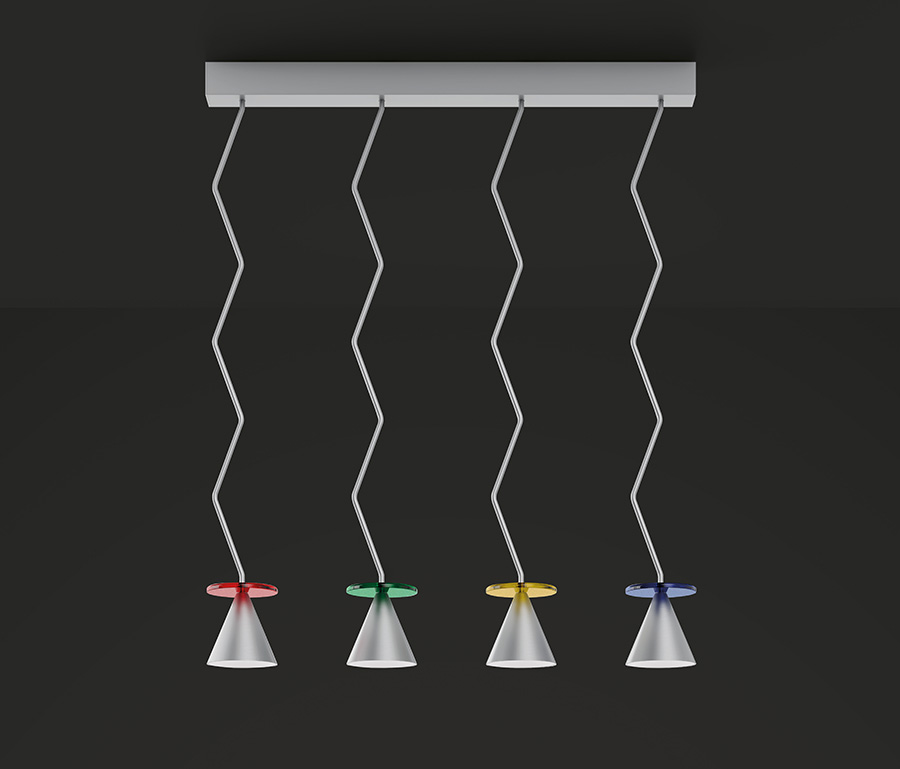 Orfeo verkörpert klare Geometrien und dynamische Linien, die mit den Farben der Glasscheiben bereichert werden. Bild: © Artemide