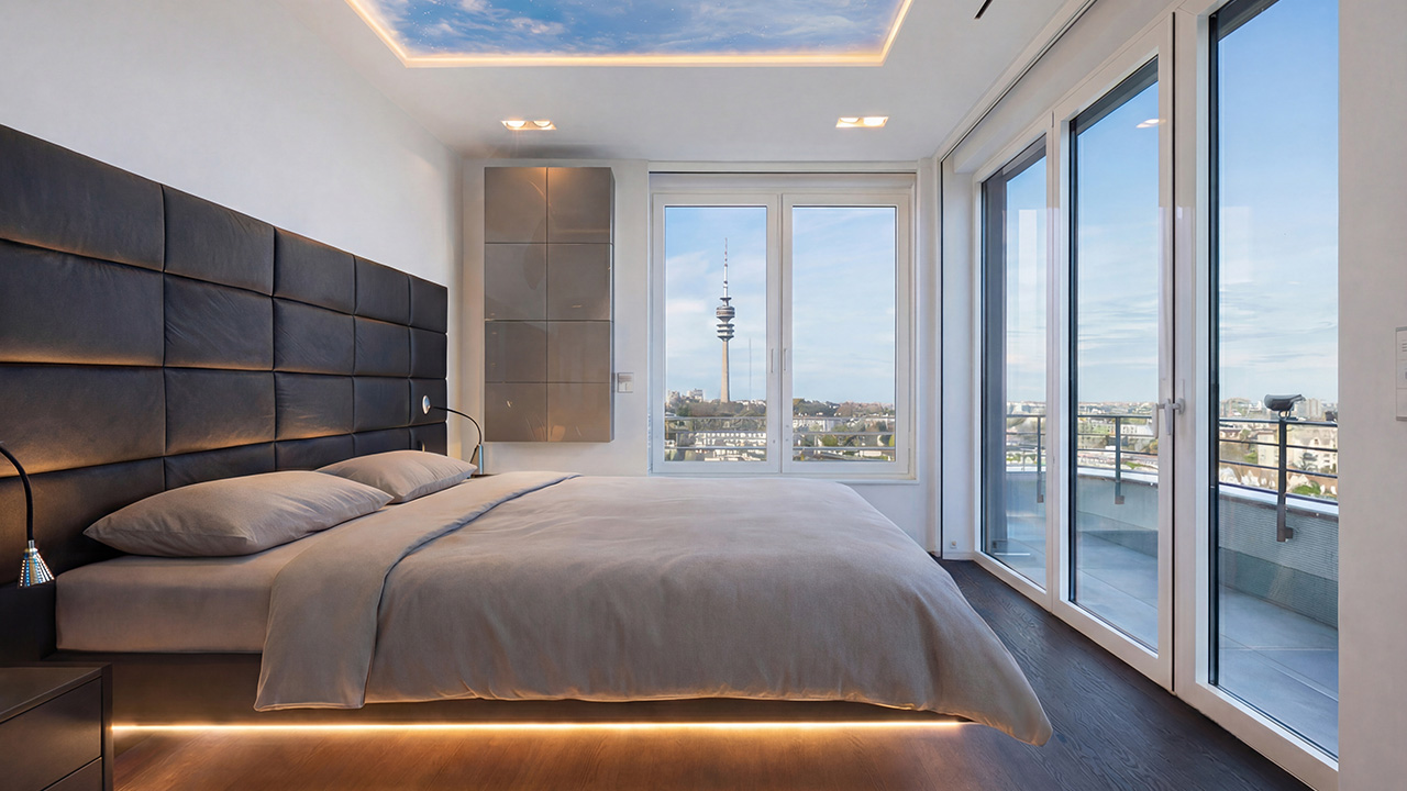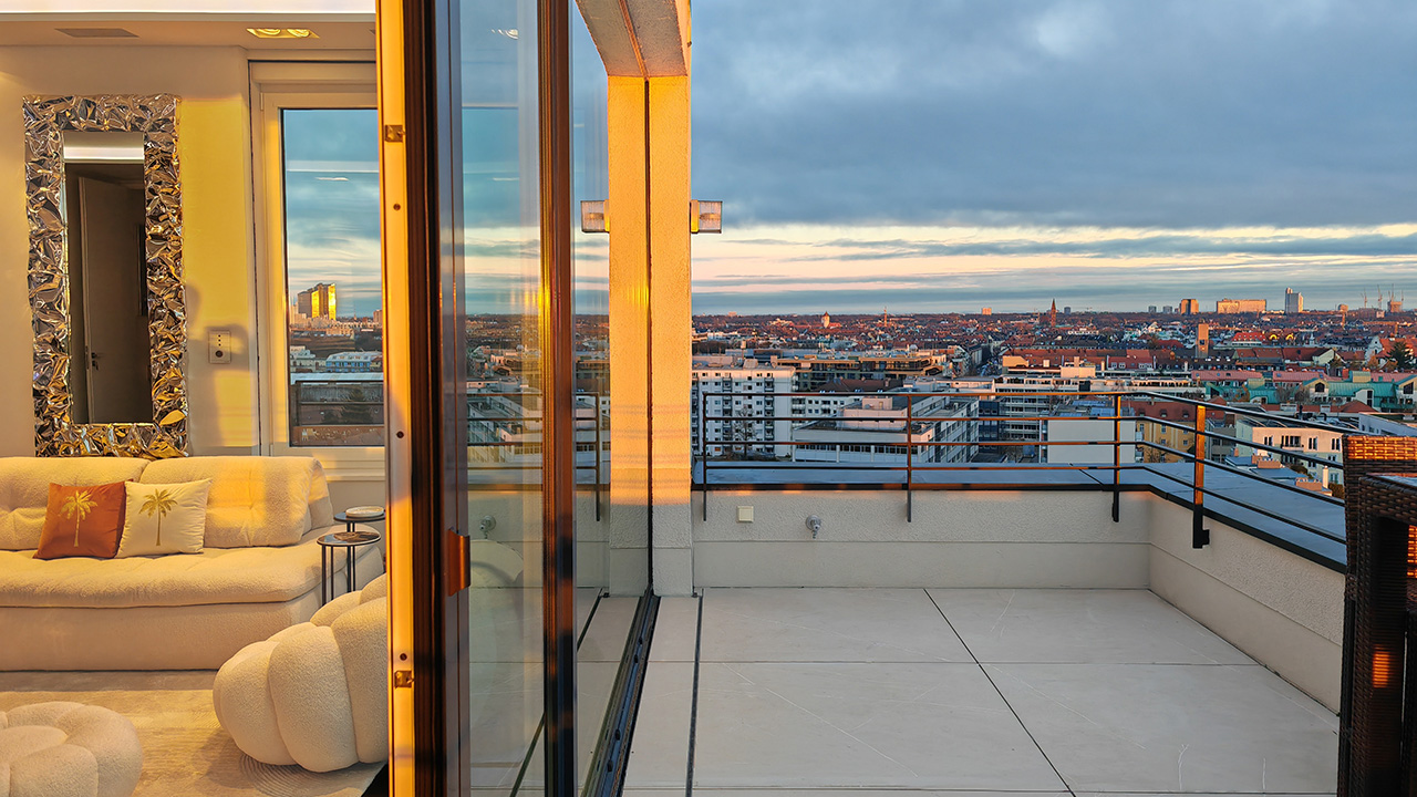 Bereits die Ankunft im 11. Obergeschoss unterstreicht den außergewöhnlichen Charakter dieses Penthouses. Das Penthouse öffnet sich zu einem klar gestalteten Eingangsbereich, von dem aus sich der offene Wohn-, Ess- und Kochbereich als Herzstück entfaltet. Großzügige Raumhöhen, bodentiefe Panoramafenster und fein abgestimmte Materialien schaffen eine Atmosphäre von Weite und Leichtigkeit. Der Blick reicht über den Olympiapark bis zur Münchner Skyline, während die südlich ausgerichtete Dachterrasse den Wohnraum harmonisch ins Freie erweitert. Die Küche überzeugt mit klarer Linienführung und hochwertiger Ausstattung. Der private Bereich ist ruhig konzipiert und umfasst vier flexibel nutzbare Schlafzimmer. Das Hauptschlafzimmer mit östlich ausgerichtetem Balkon bietet eine besondere Lichtstimmung und einen idealen Rückzugsort. Ein großzügiges Bad mit hochwertigen Materialien setzt den Anspruch konsequent fort. Moderne Haustechnik, stimmiges Licht- und Soundkonzept sowie Eichenböden vollenden ein Wohnerlebnis, das urbane Höhe, Ruhe und Design auf besondere Weise verbindet. Objekt-Nr.: 7011