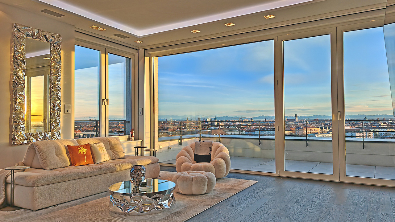 Bereits die Ankunft im 11. Obergeschoss unterstreicht den außergewöhnlichen Charakter dieses Penthouses. Das Penthouse öffnet sich zu einem klar gestalteten Eingangsbereich, von dem aus sich der offene Wohn-, Ess- und Kochbereich als Herzstück entfaltet. Großzügige Raumhöhen, bodentiefe Panoramafenster und fein abgestimmte Materialien schaffen eine Atmosphäre von Weite und Leichtigkeit. Der Blick reicht über den Olympiapark bis zur Münchner Skyline, während die südlich ausgerichtete Dachterrasse den Wohnraum harmonisch ins Freie erweitert. Die Küche überzeugt mit klarer Linienführung und hochwertiger Ausstattung. Der private Bereich ist ruhig konzipiert und umfasst vier flexibel nutzbare Schlafzimmer. Das Hauptschlafzimmer mit östlich ausgerichtetem Balkon bietet eine besondere Lichtstimmung und einen idealen Rückzugsort. Ein großzügiges Bad mit hochwertigen Materialien setzt den Anspruch konsequent fort. Moderne Haustechnik, stimmiges Licht- und Soundkonzept sowie Eichenböden vollenden ein Wohnerlebnis, das urbane Höhe, Ruhe und Design auf besondere Weise verbindet. Objekt-Nr.: 7011