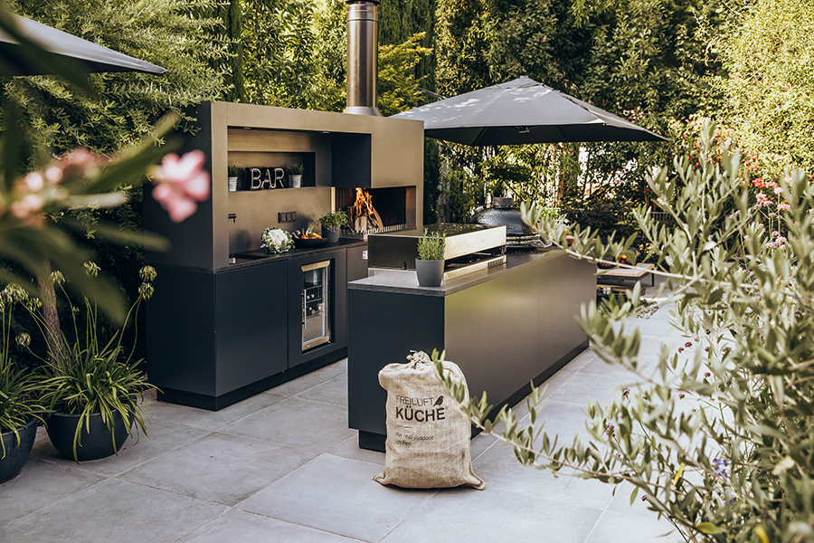 Eine FREILUFT Küche besticht durch eine klare Formensprache ohne Kompromisse in der Ausstattung und Verarbeitung. „Wir verwenden nur hochwertigste Materialien, die ganzjährig wetterbeständig sind“, erklärt der geschäftsführende Gesellschafter Till Neugebauer. Der gesamte Korpus ist von Hand verschraubt – und dennoch sieht man keine einzige Schraube. Das stimmige Gesamtbild aus pulverbeschichteten Präzisionsplatten aus See-Aluminium wird durch eine Abdeckplatte aus geflammtem Nero Assoluto abgerundet. Die Einlegeböden aus Eichenvollholz – mit außergewöhnlicher Veredelung und Bootslack-Versiegelung – bilden den harmonischen Kontrast zum soliden Aluminium und dem tiefschwarzen Nero Assoluto. Die Gestaltungsfreiheit des PureAlu Korpussystems der FREILUFT Küche bietet unbegrenzte Möglichkeiten, um individuellen Vorstellungen freien Lauf zu lassen – egal in welcher RAL-Farbe; mit frei kombinierbaren Grillfeuer-, Grill-, Wasser-, Kühl- und Insel-Elementen und zahlreichem hochwertigen Zubehör. Eine FREILUFT Küche ist massiv und doch filigran, in Offshore-Qualität geschaffen für jedes Klima – von der sommerlichen Terrasse bis zum verschneiten Rückzugsort.