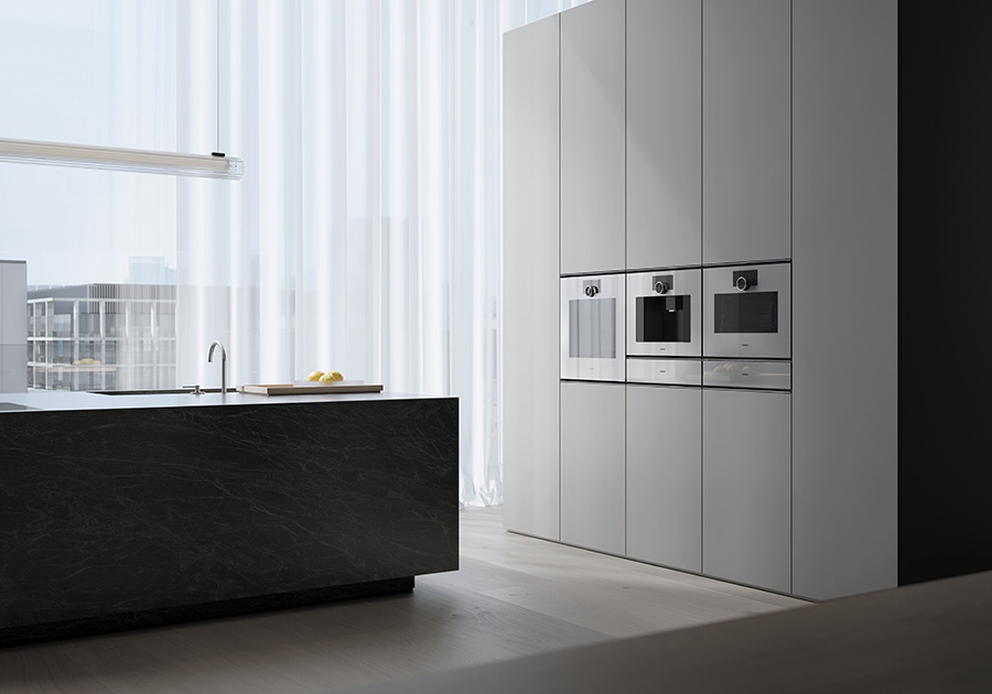 Jedes Gerät wird durch eine perfekte Mischung aus technischer Präzision und menschlicher Handwerkskunst geformt. Ausgewählte Elemente werden von Hand gefertigt, einschließlich der Endkontrolle von Materialien und Oberflächen. Wie bei der Gaggenau Serie Expressive, der zweiten Design-Linie, spiegeln klar definierte Proportionen und exakte Ausrichtungen die Aufmerksamkeit auf jeden Millimeter wider. Erhältlich ist die Gaggenau Serie Minimalistic in den Farbvarianten Gaggenau Sterling und Gaggenau Onyx. Beide Oberflächen enthalten feine Metallpartikel, um optische Tiefe zu erzeugen und auf das Umgebungslicht zu reagieren. Sterling bietet eine etwas hellere Oberfläche, die einen sanften Kontrast zu den Schränken bildet, während sich Onyx mit dem gedämpften Ton besser in dunklere Umgebungen einfügt.