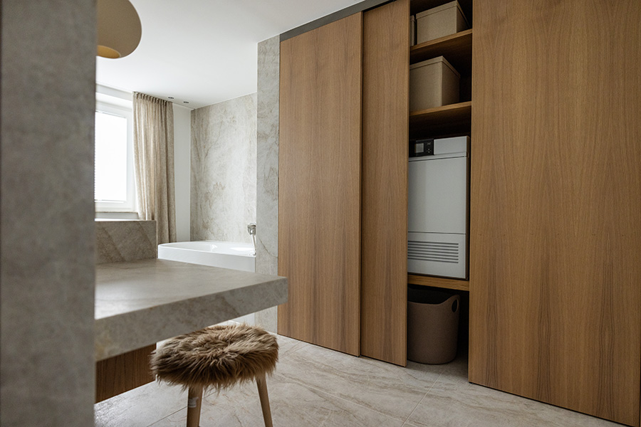 Klare Linien, natürliche Materialien und höchste Präzision prägen dieses moderne Einfamilienhaus. Das ganzheitliche Gestaltungskonzept von Wohndesign MARCHL setzt auf helle Materialien und natürliche Erdtöne, die in Kombination mit dem weiß geölten Eichenboden für eine warme, behagliche Atmosphäre sorgen. Die grifflose Küche überzeugt mit reduzierter Formensprache und fügt sich harmonisch in das offene Wohnkonzept ein. Auch im Bad setzt sich der ruhige Stil fort: Holz, Stein und zurückhaltende Farben schaffen eine entspannte, harmonische Umgebung. Ein versteckter Hauswirtschaftsbereich ergänzt das Design funktional und formvollendet.
