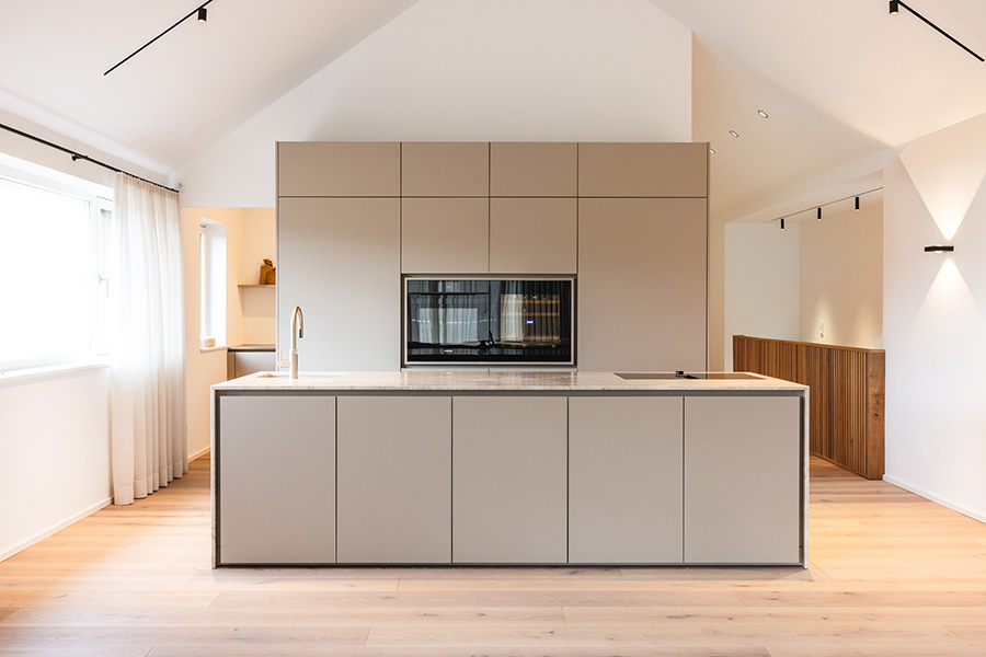 Die zeitlose Eleganz dieses Projekts von bulthaup Salzburg trifft auf durchdachte Funktionalität. Diese Küche überzeugt mit grafischer Klarheit und hochwertigen Materialien. Die zwei fugenlosen Monolith-Inseln schaffen ein Gefühl von Perfektion und Ruhe. Der Einschubschrank in Eiche, der auch als Durchreiche zur Back-Kitchen dient, und ein integrierter Weinklimaschrank setzen wohnliche Akzente. Die Aluminium-Fronten der Küche mit der warmgewalzten Edelstahl-Arbeitsplatte kontrastieren harmonisch mit dem Parkett-Fußboden. Ein architektonisches Statement, das Design und Alltag perfekt vereint – stilvoll, smart und kompromisslos modern.
