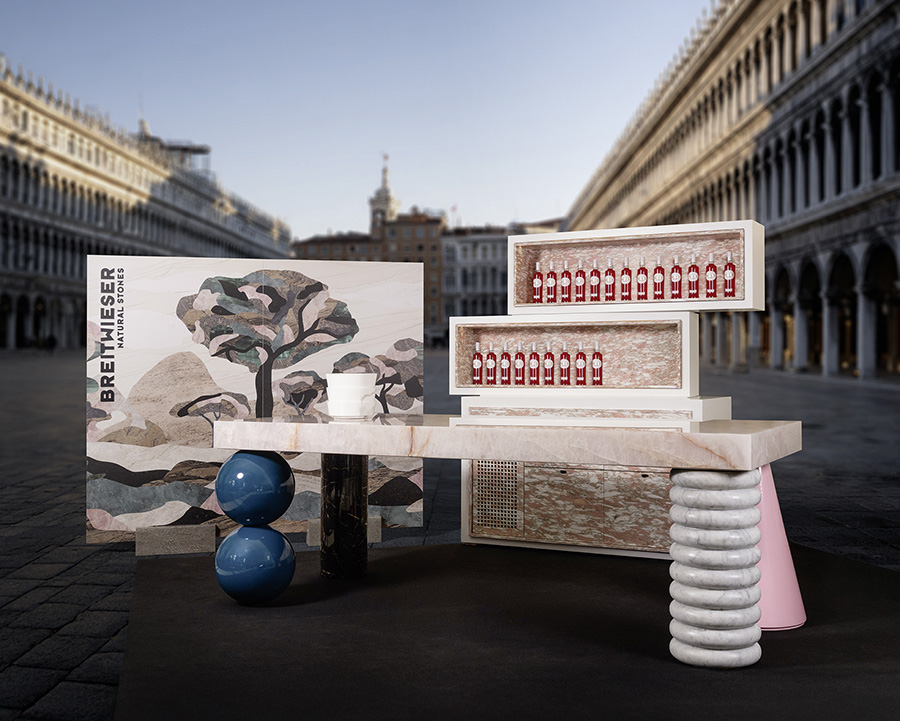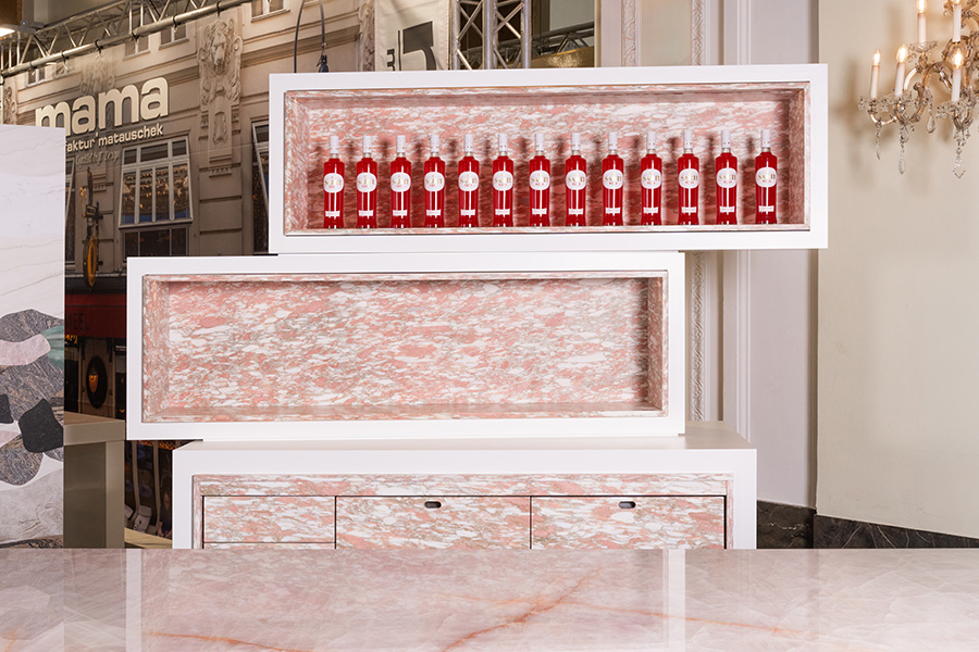 Durch das präzise Handwerk von Breitwieser wird die außergewöhnliche Härte des Rosa Quarzes zu einem gestalterischen Vorteil: Der Stein lässt sich trotz seiner Robustheit in unterschiedlichste Formen bringen – von feinen gerillten Strukturen bis zu klar geschnittenen geometrischen Körpern. In dieser Bar zeigt sich die ganze Spannbreite des Sortiments und der Materialkompetenz: Die Kombination von Rosa Quarz, Infinity Brown und Bianco Carrara sowie farbigen Akzenten demonstriert, wie vielfältig Naturstein eingesetzt werden kann. Das Zusammenspiel aus Oberflächen, Volumen und Licht offenbart die gestalterischen Möglichkeiten, die durch die Verbindung aus Materialqualität und handwerklicher Präzision entstehen. Hier trifft die Eleganz des Steins auf die Freiheit von Farbe, Muster und Form. TRIBUTE to MEMPHIS ist ein Setting, in dem Divergenz zur Schönheit wird – Stein wird lebendig, pulsierend, überraschend und integrativ. Inspiriert von der rebellischen Freiheit der Memphis-Gruppe entsteht ein Ort zwischen Glamour und Rebellion, zwischen Luxus und Leichtigkeit – ein Designcocktail voller Energie, Freude und zeitloser Strahlkraft.
