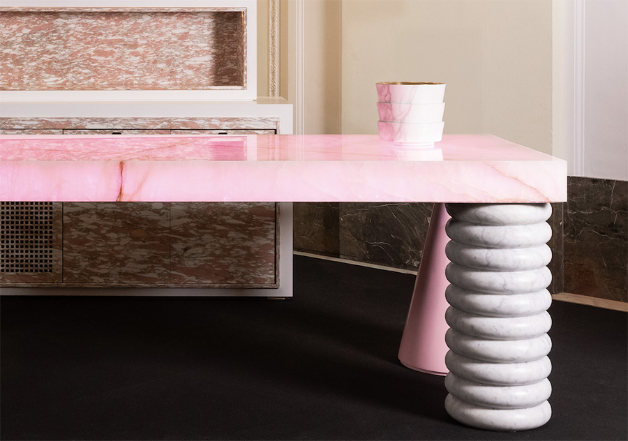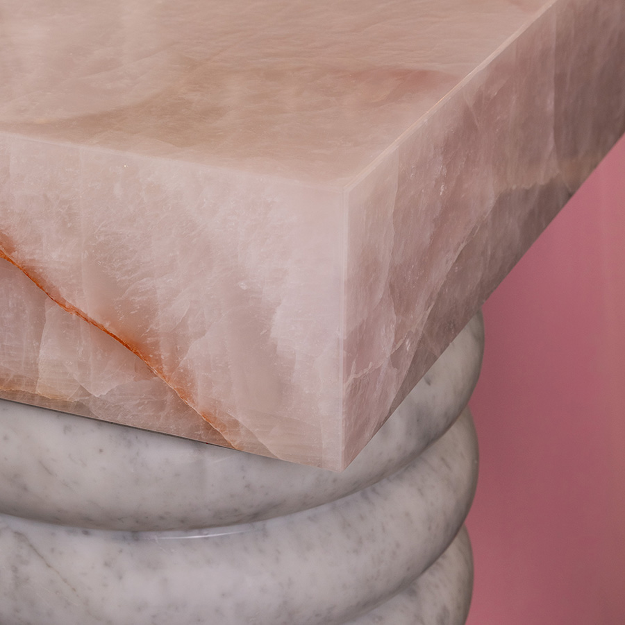 Steinplatte: Rosa Quarz (Cristallo rosa), runde Säule: Infinity Brown (Quarz), gerillte Säule: Bianco Carrara (Marmor), Rückwand & Schrank: Flamingo