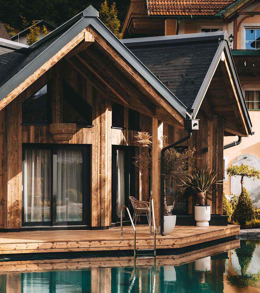 Regardless where you shift your gaze, from the textile stringed wall panels in the living zone to the oak/textile combination of the meticulously finished cabinets, each and every element adheres to the primordial credo of the house. The ROHO pond lodges are far more than luxurious guest suites, they are a priceless, irreplaceable refuge for body, mind and soul…and a soft-spoken homage to the beauties of simplicity.