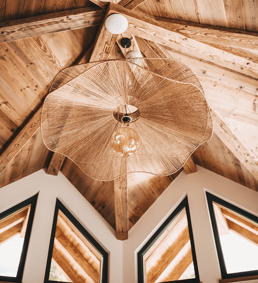 The exterior walls are inner-constructed of wood, then panelled in old wood, then connected inside with white plastered walls and finely stringed, single-sided textile panels. The rooftop truss was implemented in tiled slabs inspired by the form of a water lily, lending the interior spaces a deep tranquillity. It is underpinned by the warm optical ambience of sun-scorched old wood. Spacious window surfaces outlined by charcoal-coloured frames open the room to outdoor nature and invite both the light and the landscape to become integral parts of the interior. The terraces are of larch wood, the oaken floors are laid in octagonal modules, the individually finished oaken furniture is a story of quality in itself, radiating perpetualness and a dedication to detail.