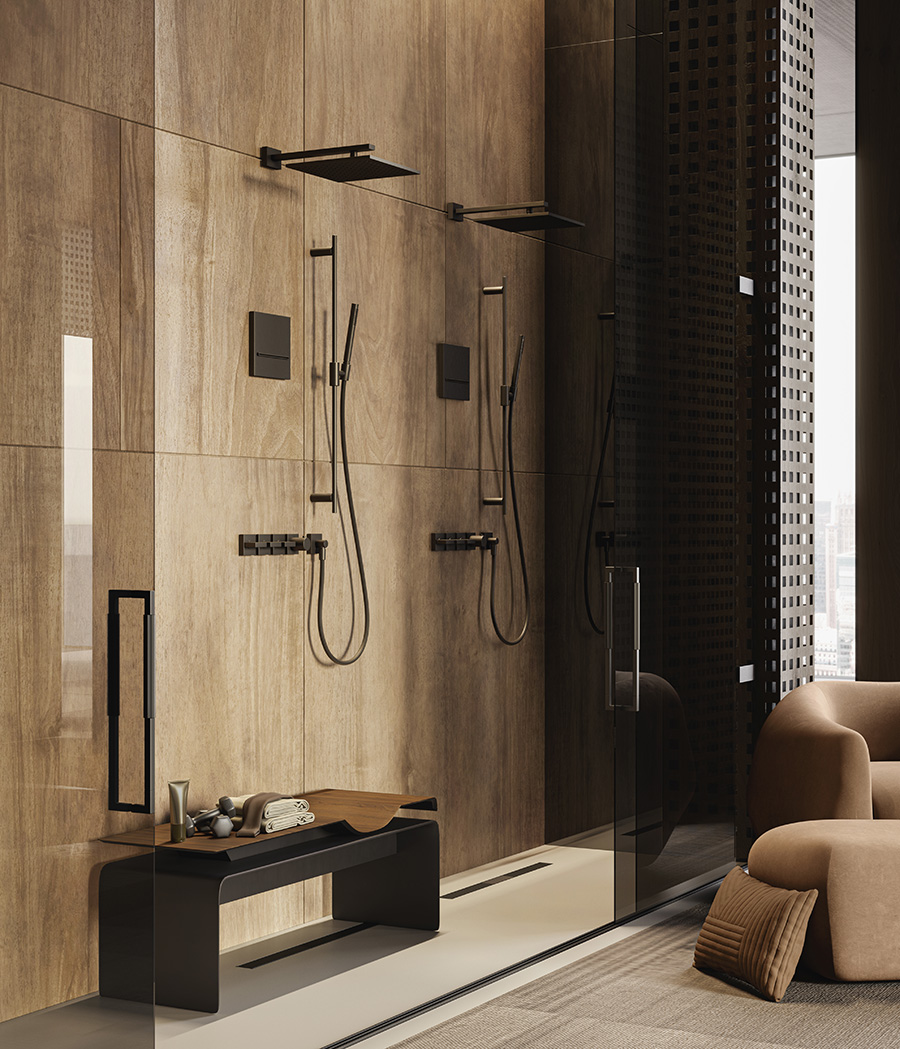 INVERSO bears the indelible stamp of “METALLO TESSUTO” (interwoven metal). Rectangles and spheres flow together to form a fascinating synergy, trailblazing onward to reach a brilliant lightness and purity of form. Equally innovative is also the new ergonomics of the multi-directional gate valve. Yet above all else, it is the textures of “interwoven metal” – RIGATO and DIAMANTATO – which actually generate interchanging surfaces between the various elements. INVERSO is superbly well suited to lend urban interior rooms a breath of avantgarde.