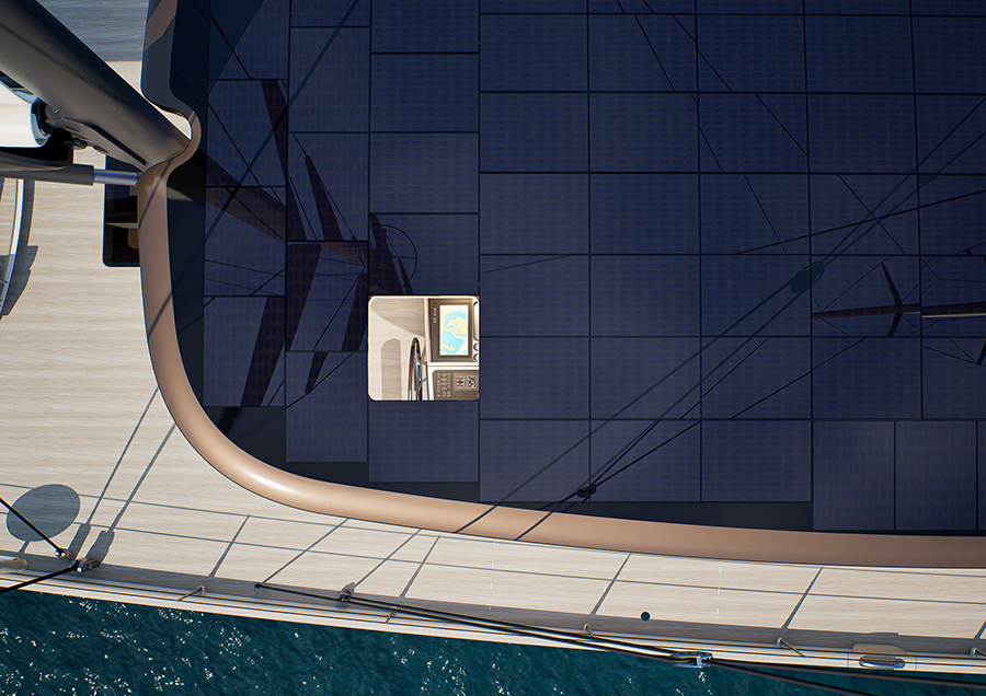 “Zero“ combines wind, solar, and thermal energy for propulsion. At the core is a five-megawatt-hour battery system – roughly equivalent to the capacity of 88 Tesla vehicles. Energy is generated through multiple sources: hydrogenerating thrusters harvest power from water flow while sailing, 100 square metres of hybrid solar panels capture sunlight, and an onboard wind turbine converts offshore winds into electricity.