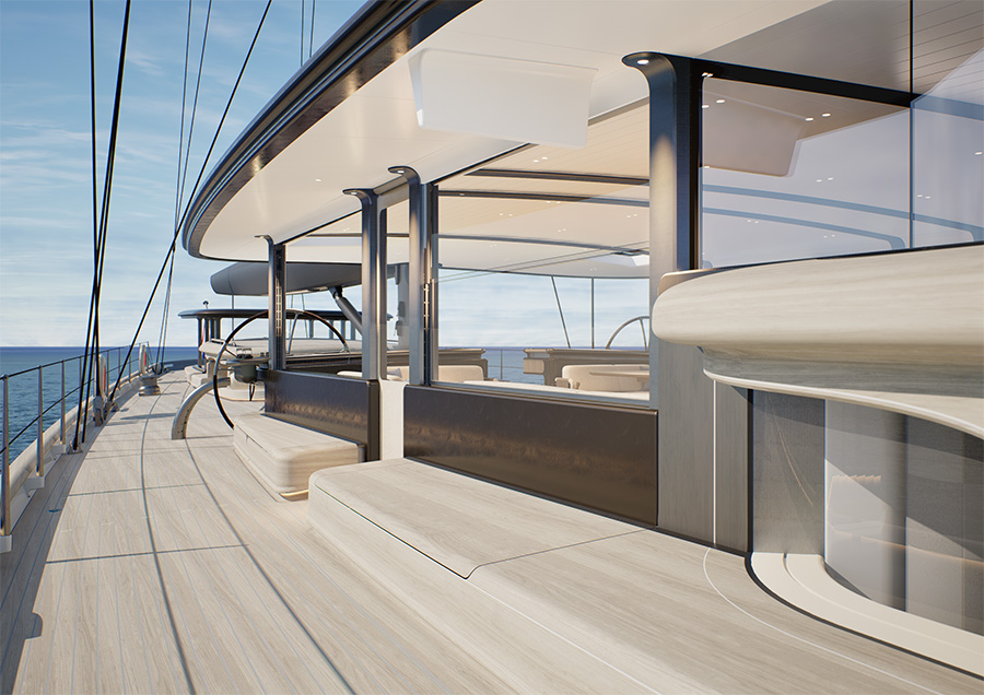In addition to private use and occasional charters, “Zero“ offers accommodation for up to 12 guests. Her interiors feature eco-conscious materials, including pine bark leather and sustainably processed marble with a soft, leather-like finish.