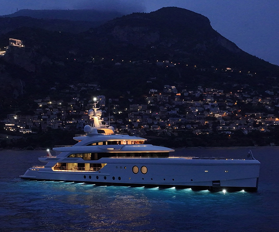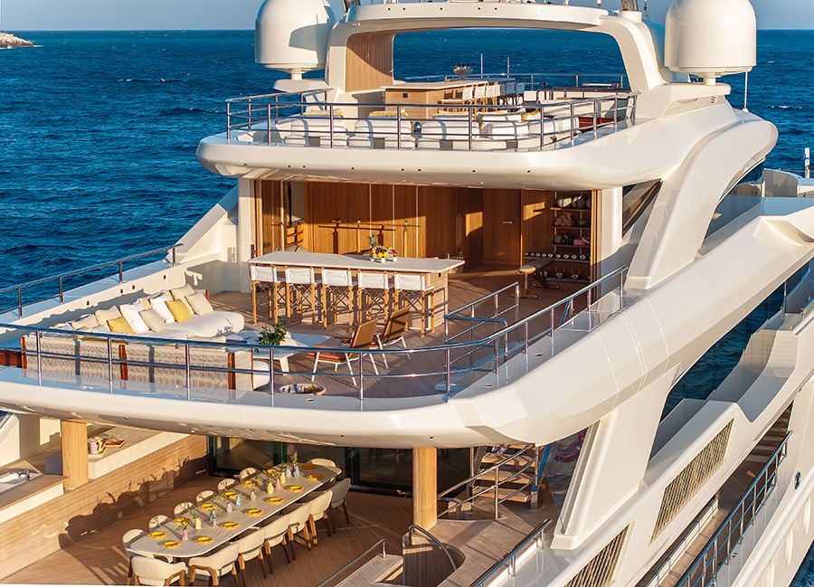 The decks offer ample space for entertaining and entertaining guests. Inside, the yacht boasts a state-of-the-art and at times playful interior.