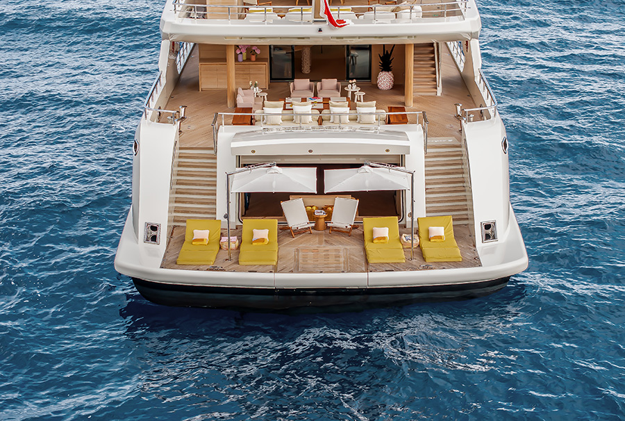 Side steps lead to the spacious bathing platform. Here, owners and guests can enjoy the proximity to the water while at anchor. A beach club is located inside.