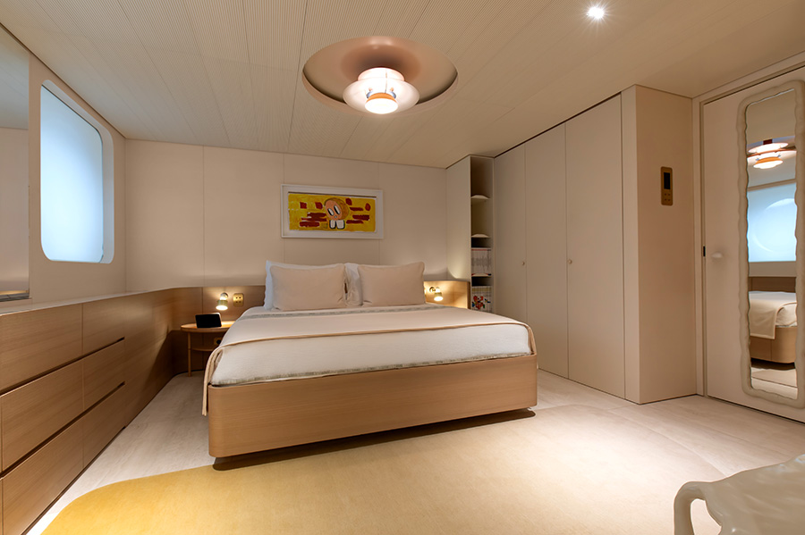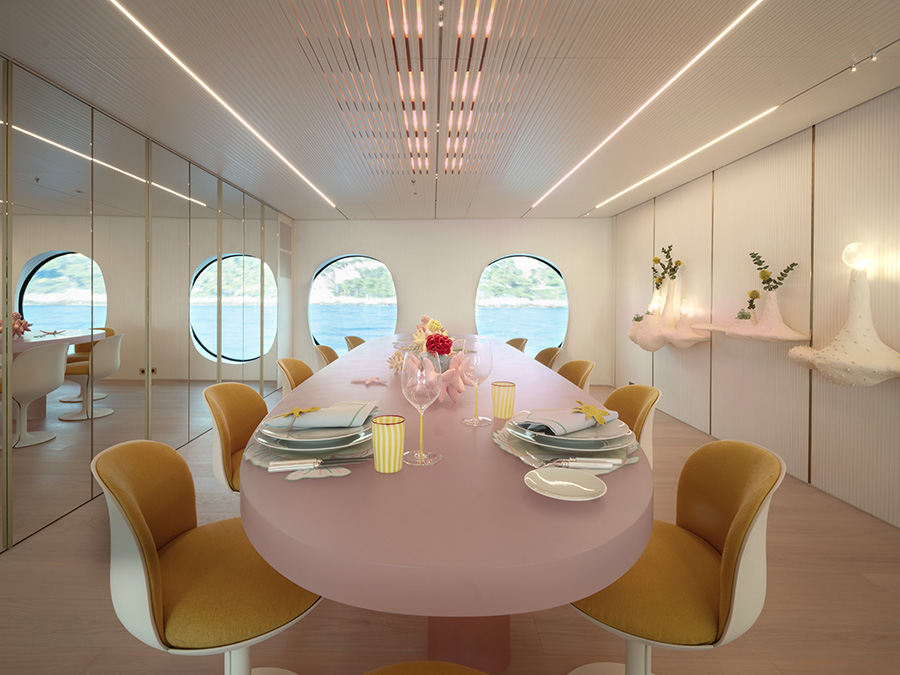 Below, the interior is disarmingly relaxed. Pink-tinted wood veneer, limed oak floors, and a soft tonal palette create a calming canvas. Furnishings are sculptural yet minimal, favouring comfort over spectacle. Custom details abound, from a tree-trunk snack cabinet in the saloon to a travertine staircase with a sinuous handrail crafted by Lebanese artist Tamara Barrage. The main deck forepeak, traditionally an owner’s suite in modern yachts, has been reimagined as a formal dining area anchored by a pink resin table and Middle Eastern-designed furniture – a bold nod to heritage and personal expression. The owner’s suite, meanwhile, is located on the upper deck, paired with a private lounge and the yacht’s only television.