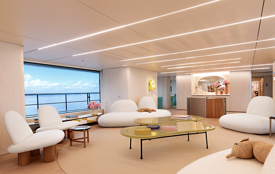 The 67-metre “Kasper 7“ was chosen by long-time Benetti owner Karim Karagulla as an upgrade from his previous Benetti Classic. But it was his wife, interior designer Nisrine Karagulla of Askdeco, who redefined the yacht’s soul. Drawing on her background in high-end residential design, she led a quiet revolution: one that rejected mirrored surfaces and high-gloss finishes in favour of natural textures, playful forms, and emotional warmth.