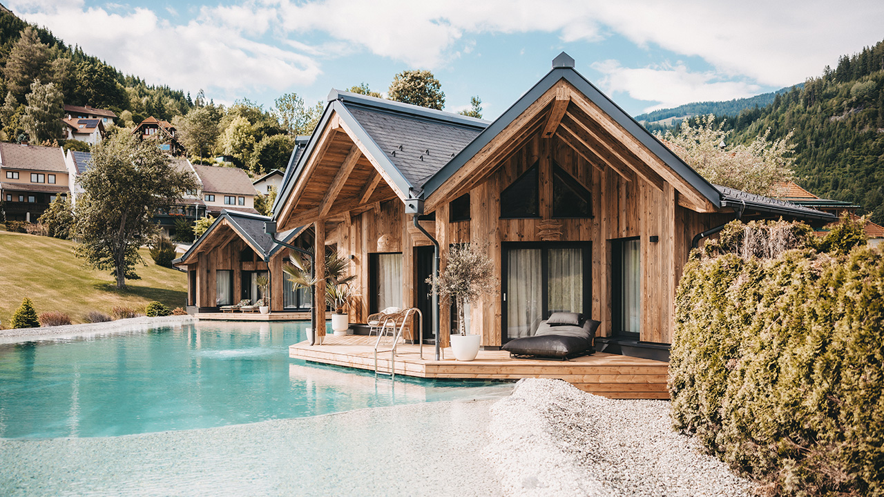 Teich-Lodges als Orte der Stille. Dieses Projekt wurde inklusive Interior von Holzbau Maier komplett aus einer Hand realisiert.