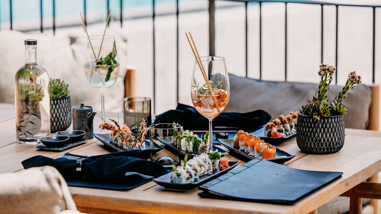 Die großzügige Sonnenterrasse direkt am Wasser lädt dazu ein, die Speisen unter freiem Himmel zu genießen. Ergänzt wird das kulinarische Angebot durch ausgewählte Weine und eine abwechslungsreiche Sake-Auswahl. Die offene Showküche ermöglicht Einblicke in die Arbeit der Sushi-Meister und Köche. Auch das Design des Mizūmi ist ein Statement: hochwertige regionale Materialien treffen auf japanisches Flair, helle Tische kontrastieren mit dunklen, edlen Farbtönen und schaffen eine Atmosphäre, die Ruhe ausstrahlt und den Blick auf die umliegende Natur lenkt. Große Fenster rahmen Wiesen, Wälder und den See ein und verbinden Architektur und Landschaft zu einer harmonischen Einheit.